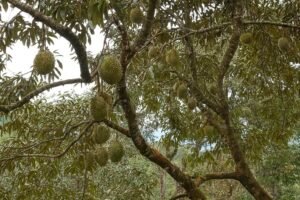 “Salah satu pohon durian milik Fahmi yang tengah berbuah lebat di kebun pribadinya.”