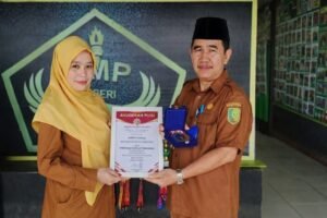 Kepala SMP Negeri 2 Sambas, Urai Sumadi, berpose bersama guru Bahasa Indonesia, Riski Puspita Sari, sambil memegang piagam dan kalung penghargaan sebagai bentuk apresiasi atas dedikasi dalam membimbing siswa hingga berhasil menorehkan prestasi literasi melalui karya antologi puisi yang mengharumkan nama sekolah di tingkat ASEAN.